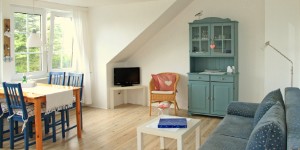 Das Wohnzimmer ist gemütlich eingerichtet und mit einem Essbereich ausgestattet. Der Fernseher verfügt über DVB-T Empfang, DVD und USB-Anschluss. Im Untergeschoss befindet sich ein Bauernschrank mit CD's ,DvD's , Büchern und Spielen.